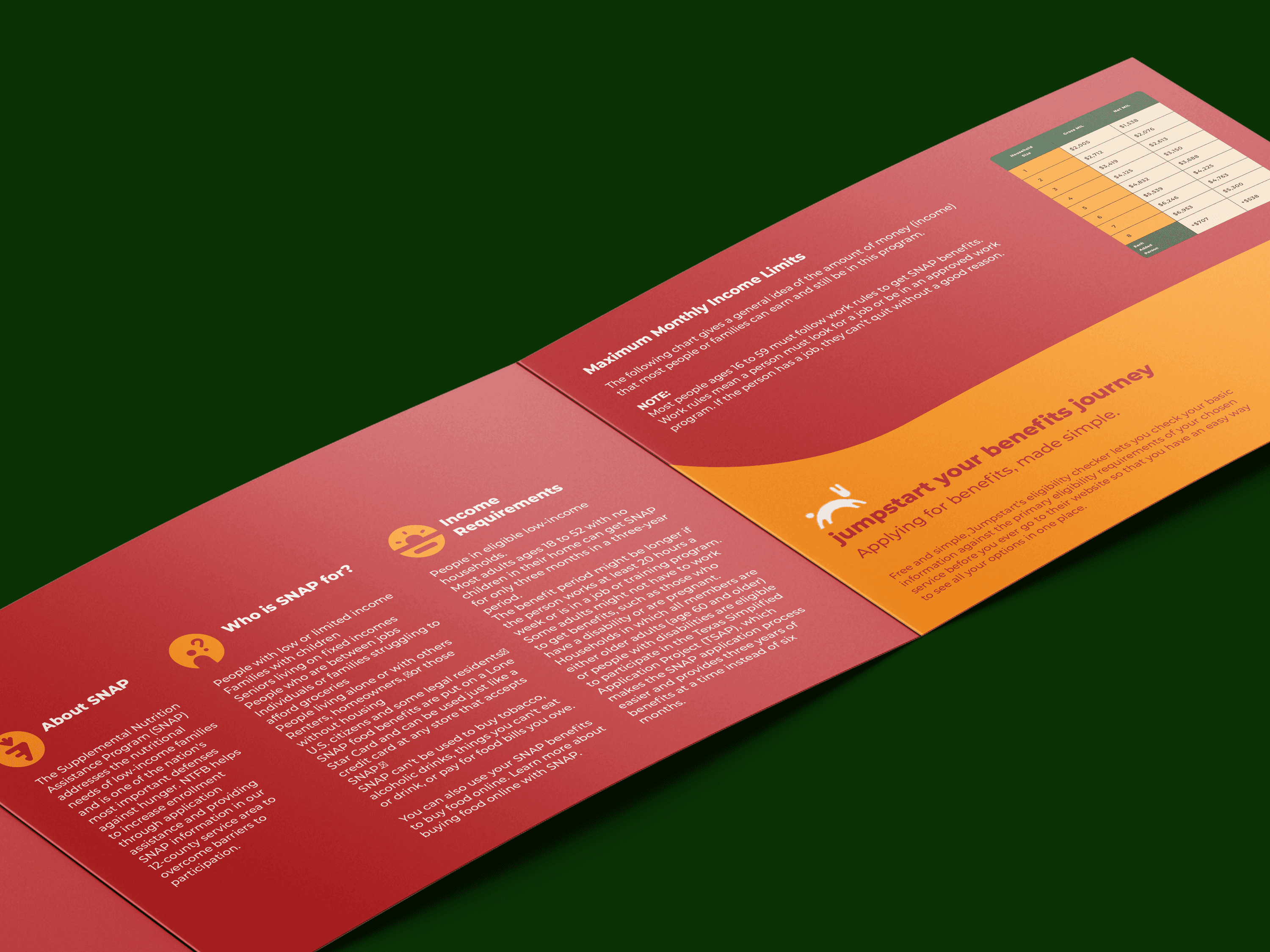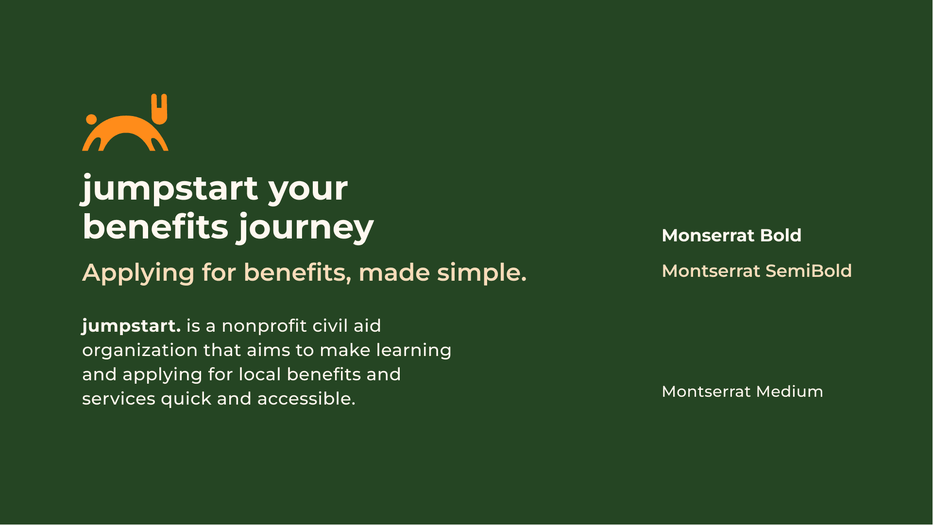 Jumpstart is a nonprofit civil aid organization that aims to make learning and applying for local benefits and services quick and accessible through their website, featuring simplified descriptions for local benefits and services, an application-aid chatbot, and a 5 minute quiz to help you get started.